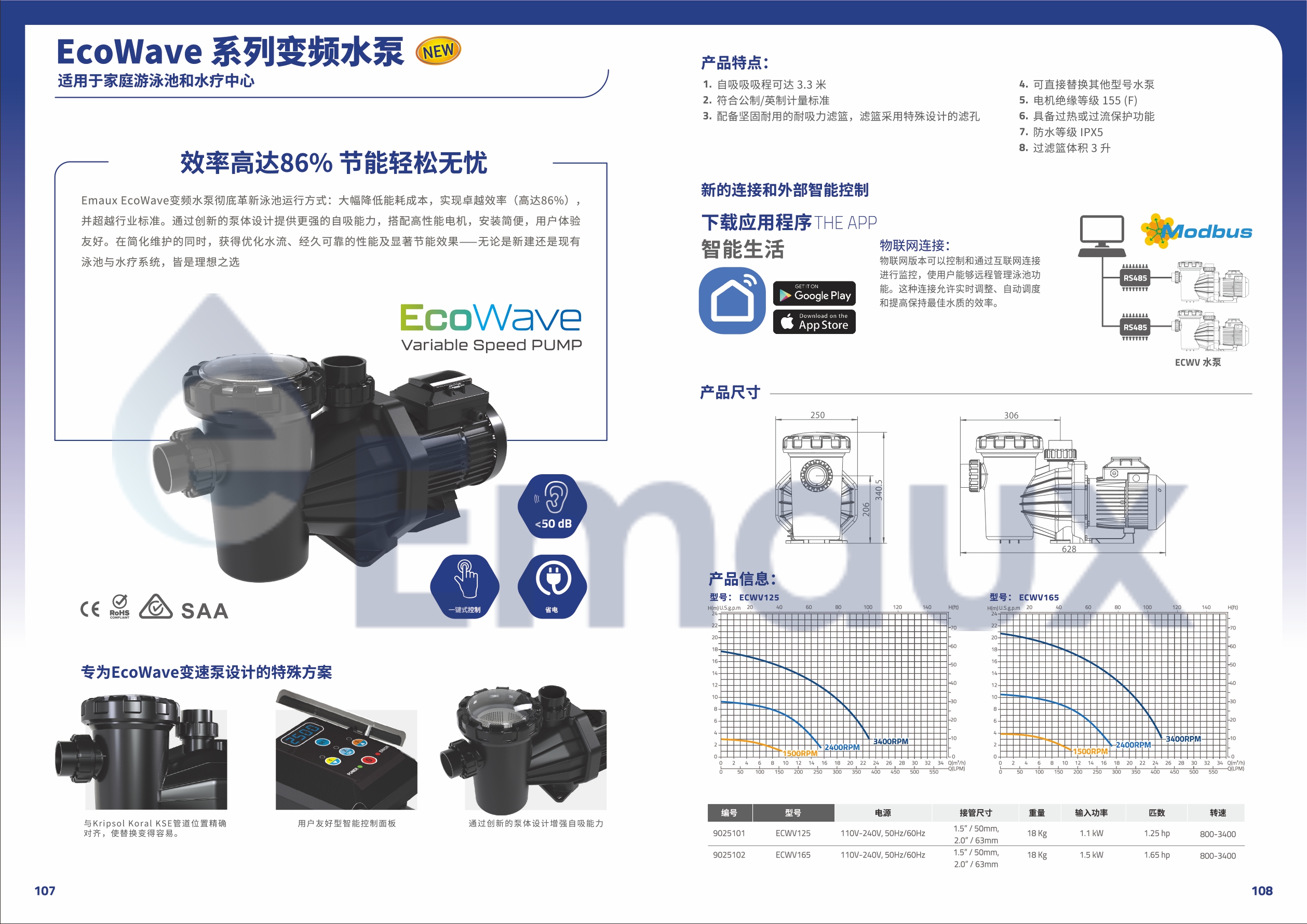 Emaux EcoWave变频水泵彻底革新泳池运行方式:大幅降低能耗成本,实现卓越效率(高达86%),并超越行业标准。通过创新的泵体设计提供更强的自吸能力,搭配高性能电机,安装简便,用户体验友好。在简化维护的同时,获得优化水流、经久可靠的性能及显著节能效果——无论是新建还是现有泳池与水疗系统,皆是理想之选