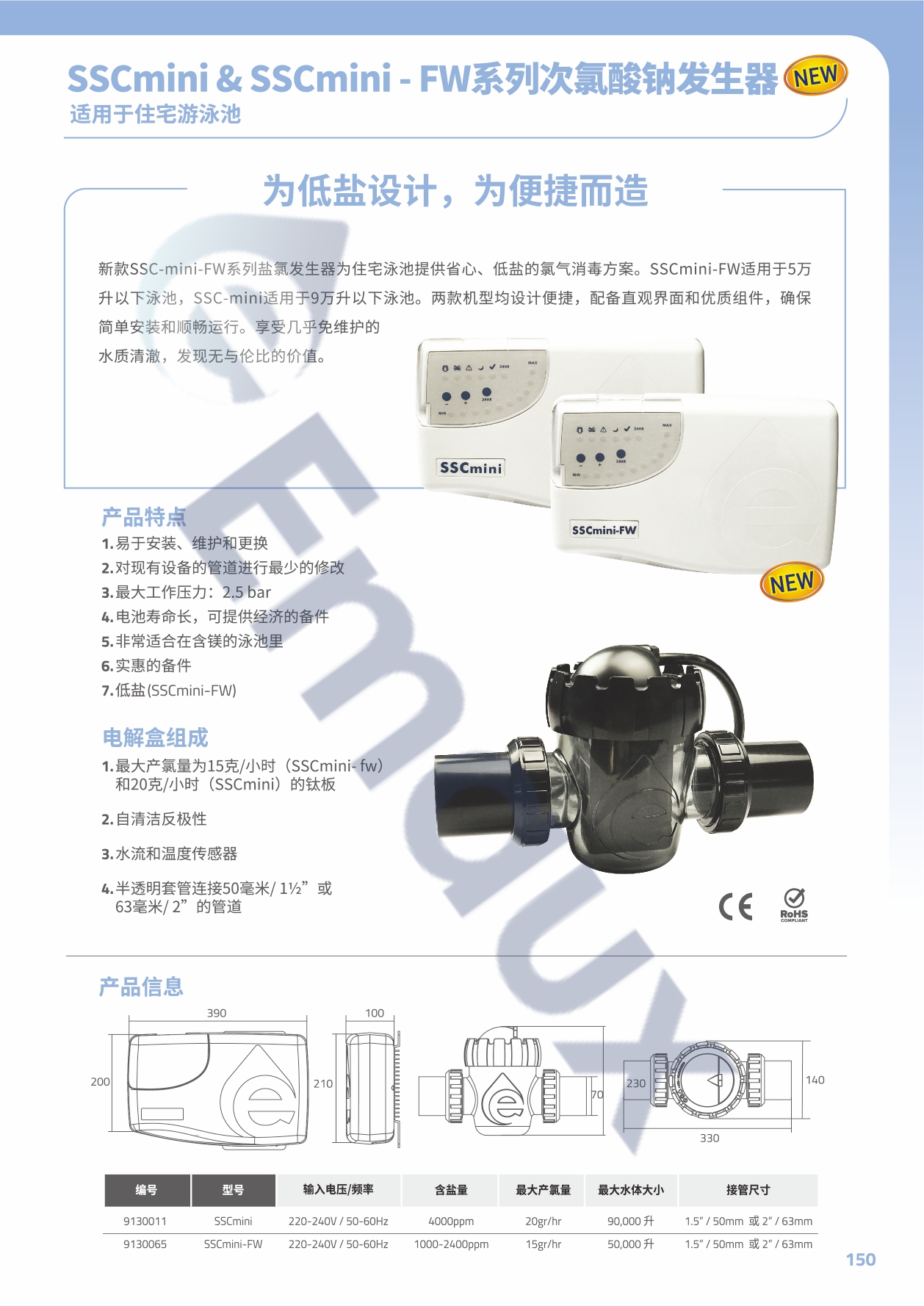 新款SSC-mini-FW系列盐氯发生器为住宅泳池提供省心、低盐的氯气消毒方案。SSCmini-FW适用于5万 升以下泳池,SSC-mini适用于9万升以下泳池。两款机型均设计便捷,配备直观界面和优质组件,确保 简单安装和顺畅运行。享受几乎免维护的 水质清澈,发现无与伦比的价值。