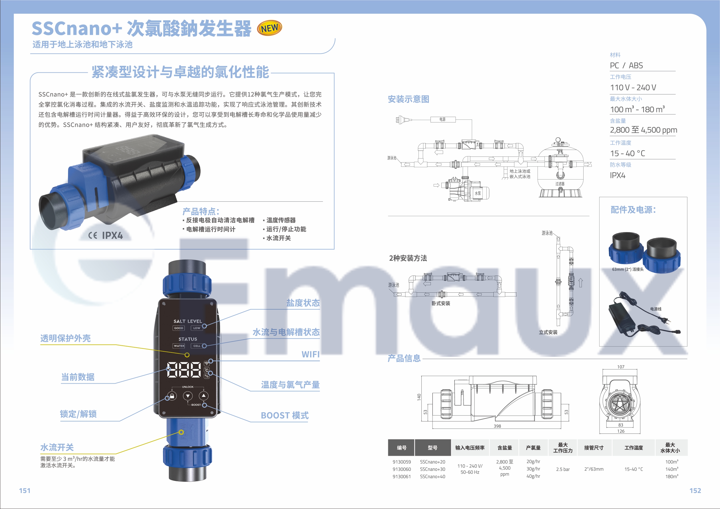 SSCnano+ 是一款创新的在线式盐氯发生器,可与水泵无缝同步运行。它提供12种氯气生产模式,让您完 全掌控氯化消毒过程。集成的水流开关、盐度监测和水温追踪功能,实现了响应式泳池管理。其创新技术 还包含电解槽运行时间计量器。得益于高效环保的设计,您可以享受到电解槽长寿命和化学品使用量减少 的优势。SSCnano+ 结构紧凑、用户友好,彻底革新了氯气生成方式。