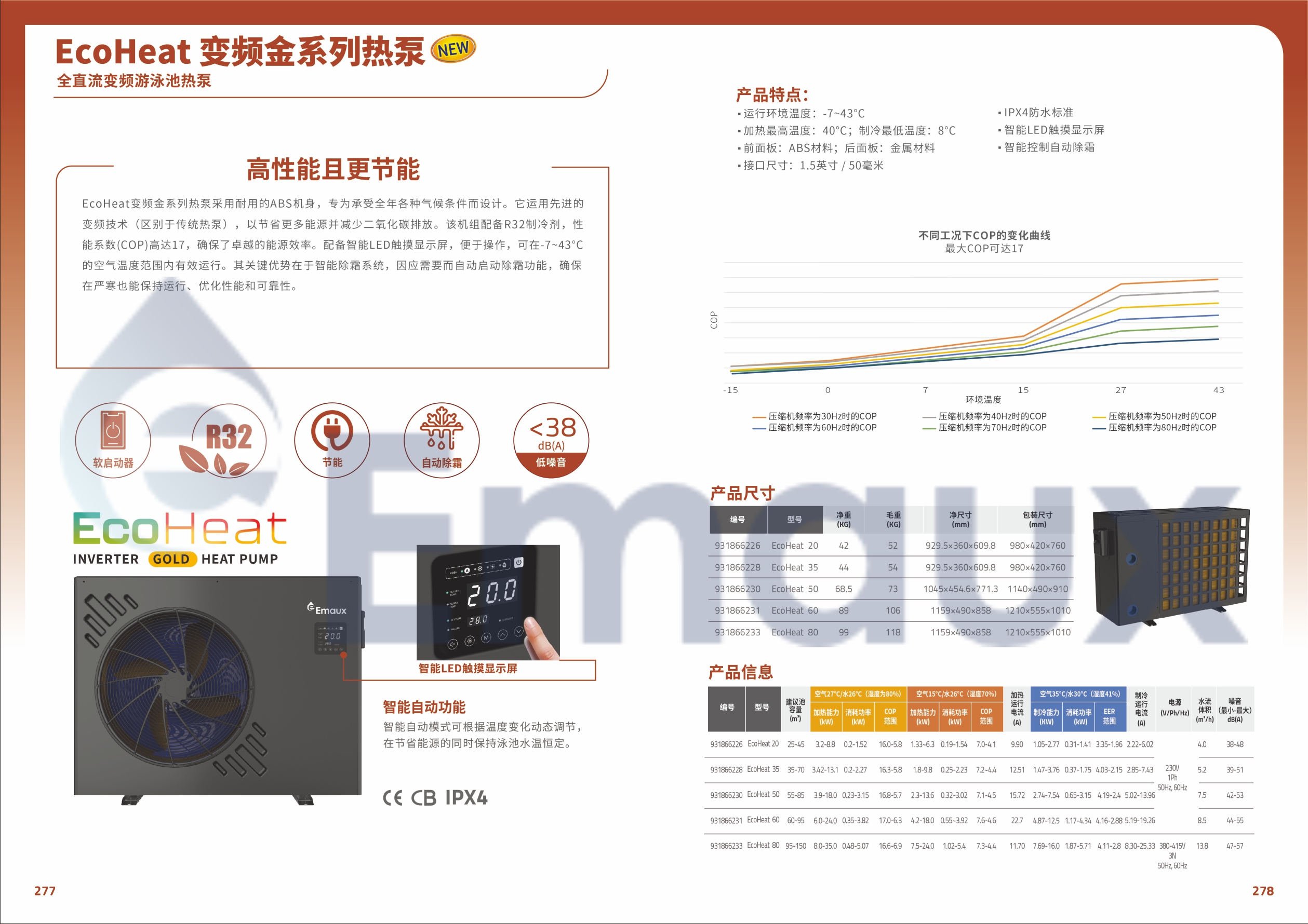 EcoHeat变频金系列热泵采用耐用的ABS机身,专为承受全年各种气候条件而设计。它运用先进的 变频技术(区别于传统热泵),以节省更多能源并减少二氧化碳排放。该机组配备R32制冷剂,性 能系数(COP)高达17,确保了卓越的能源效率。配备智能LED触摸显示屏,便于操作,可在-7~43°C 的空气温度范围内有效运行。其关键优势在于智能除霜系统,因应需要而自动启动除霜功能,确保 在严寒也能保持运行、优化性能和可靠性。