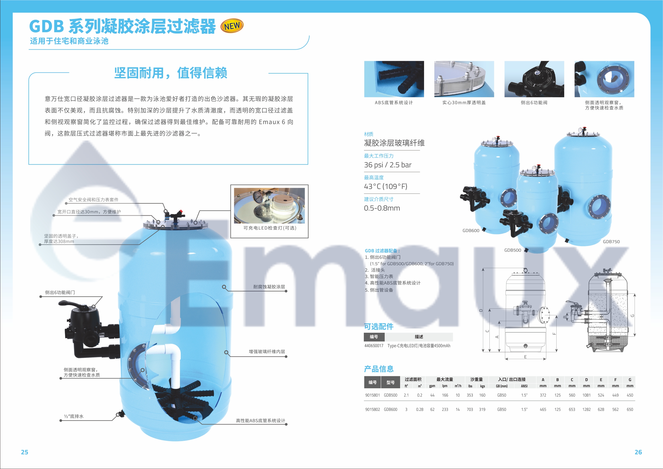 意万仕宽口径凝胶涂层过滤器是一款为泳池爱好者打造的出色沙滤器。其无瑕的凝胶涂层 表面不仅美观,而且抗腐蚀。特别加深的沙层提升了水质清澈度,而透明的宽口径过滤盖 和侧视观察窗简化了监控过程,确保过滤器得到最佳维护。配备可靠耐用的 Emaux 6 向 阀,这款层压式过滤器堪称市面上最先进的沙滤器之一。