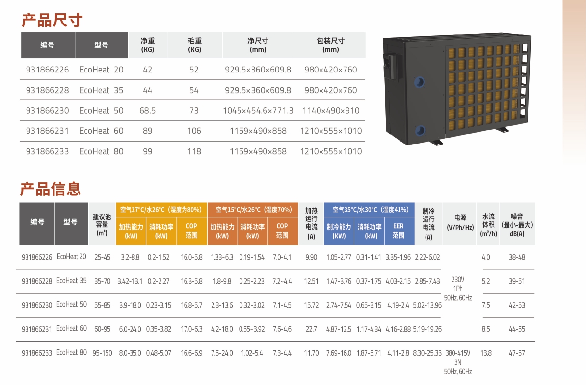 EcoHeat变频金系列热泵采用耐用的ABS机身,专为承受全年各种气候条件而设计。它运用先进的 变频技术(区别于传统热泵),以节省更多能源并减少二氧化碳排放。该机组配备R32制冷剂,性 能系数(COP)高达17,确保了卓越的能源效率。配备智能LED触摸显示屏,便于操作,可在-7~43°C 的空气温度范围内有效运行。其关键优势在于智能除霜系统,因应需要而自动启动除霜功能,确保 在严寒也能保持运行、优化性能和可靠性。